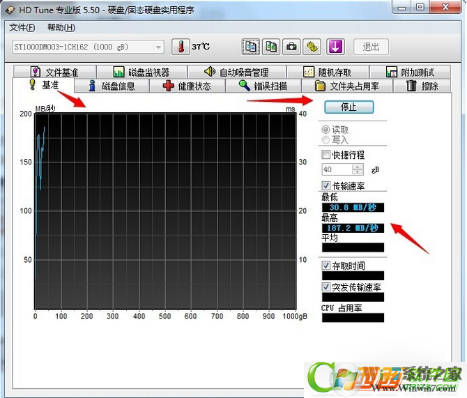 1、如果买了一个新的硬盘可以通过基准功能测试一下硬盘的读写速度,读写测试是单选的请注意选择。值得注意看的是最低的速度和最高的速度