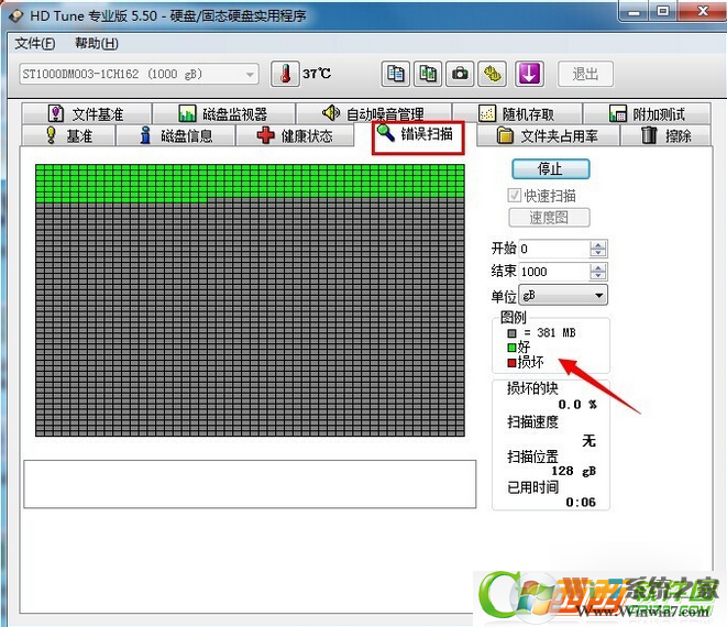 2、错误扫描就是扫硬盘有没有坏道,如果硬盘上有坏道会导致系统卡顿死机这一类的现象。如果有在HD Tune表现就是显示示红色的小方块。正常会显示示绿色的方块
