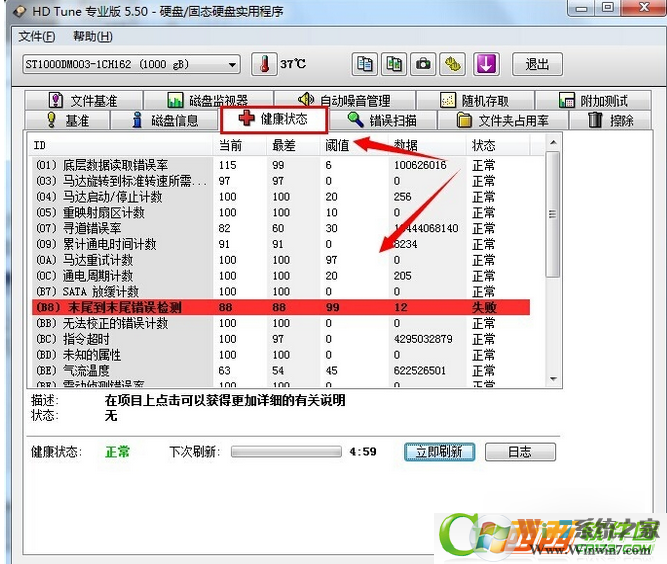 3、硬盘除了看有没有坏道以外,需要看的是硬盘的健康状态,状态下都是正常说明你的硬盘是好的。如果有出现失败的状态则需要保存好你的资料备更换硬盘哦