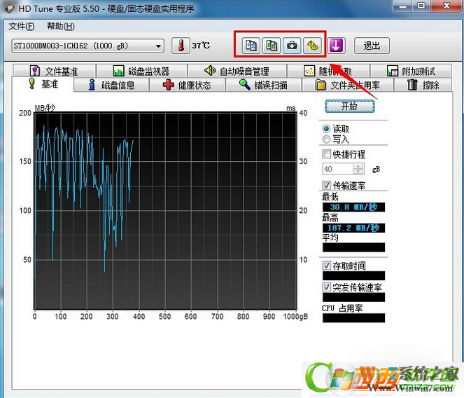 5、在HD Tune软件的顶部有复制测试结果工具,还有为文软件拍照的工具,HD Tune选项也是在这个位置