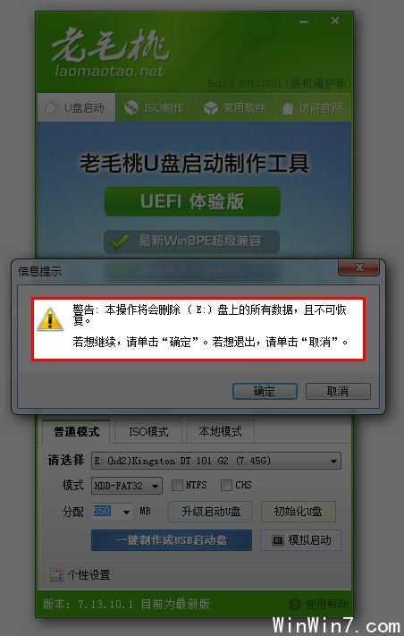 按钮,程序会提示是否继续,确认所选U盘无重要数据后开始制作: