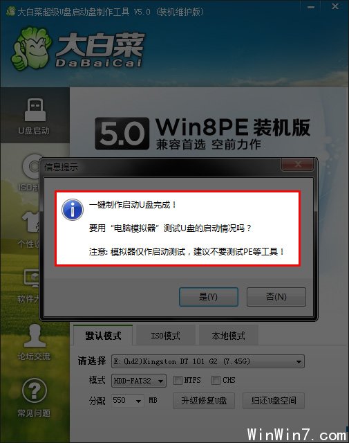 第二步:用大白菜U盘装系统软件制作启动U盘
